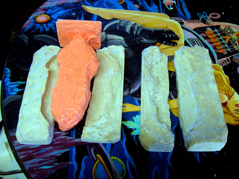 I'd like to show you the final solution and then I'll explain how I arrived here. This is the rubber mold and the 4-piece mother mold made of a hard plaster called Hydrocal. Even better would have been Ultracal, but I didn't have any on hand.